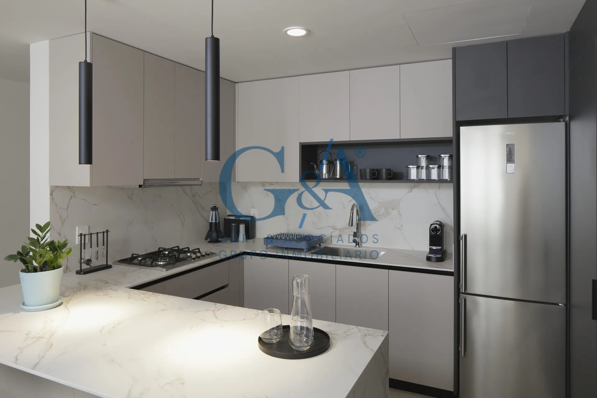 Cocina equipada con piedra tecnológica, electrodomésticos incluidos y sistema de cerrado lento.